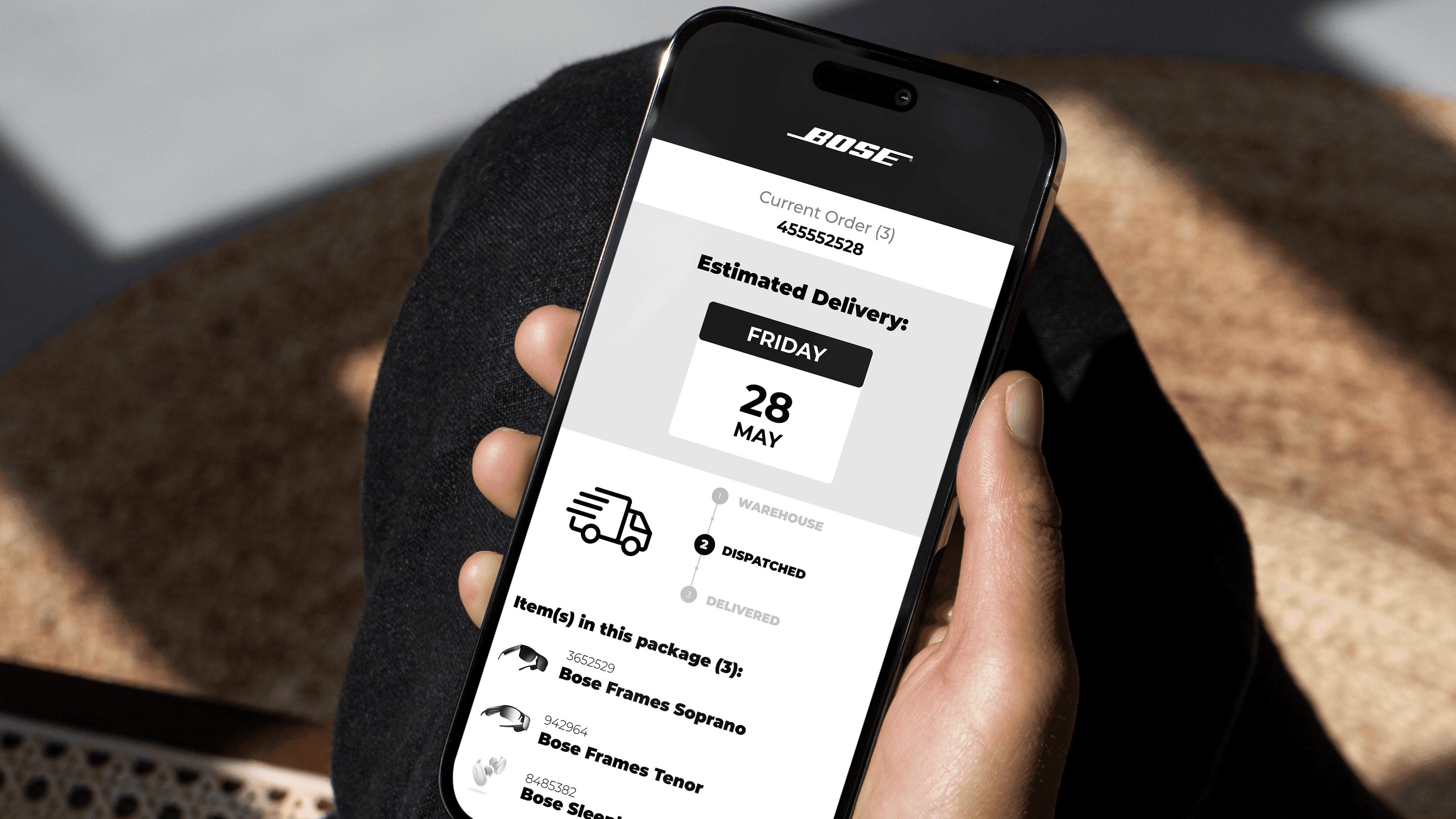 Post-purchase UX for Bose. Designed at parcelLab to turn a tracking email into a branded touchpoint.
