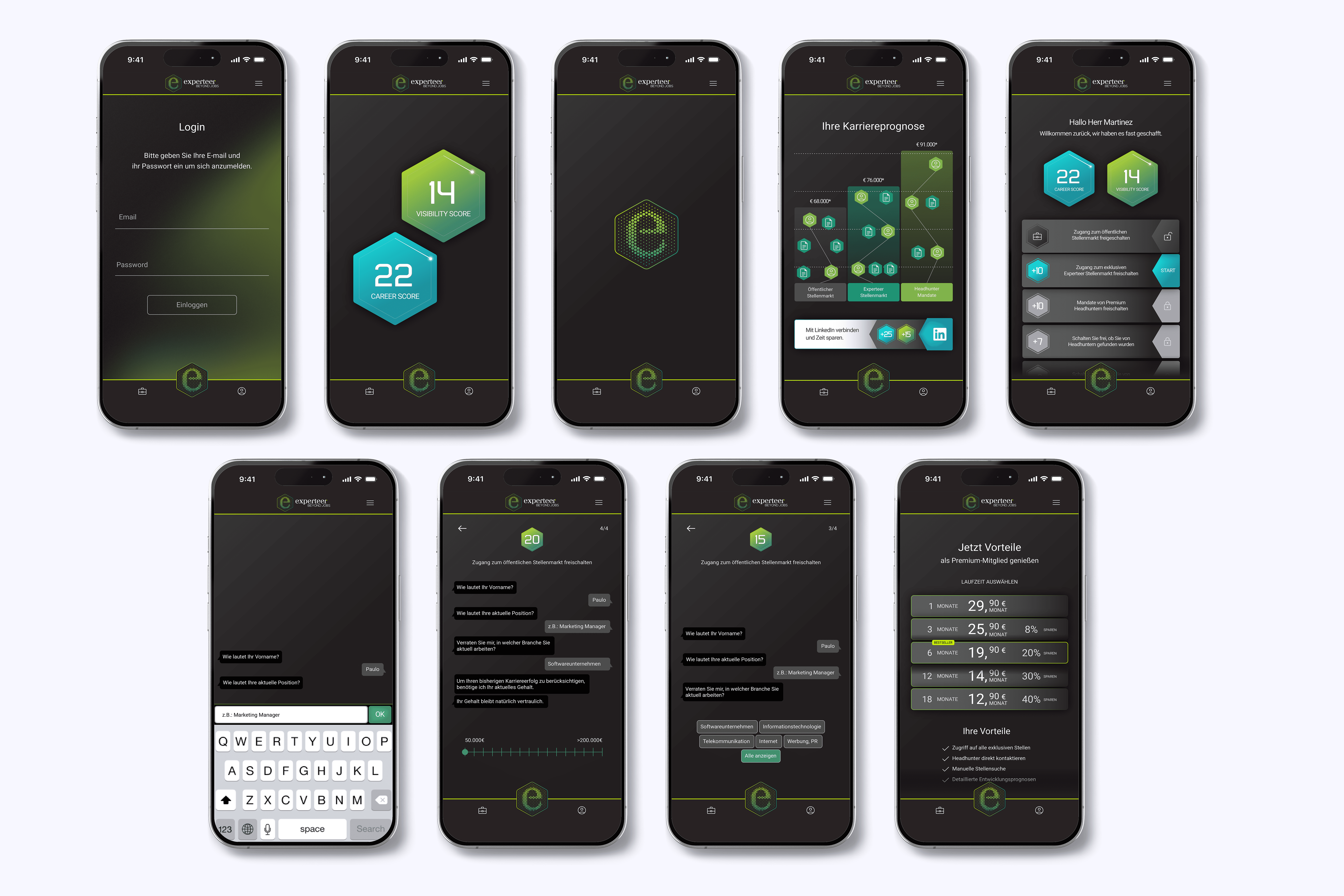 Experteer is a Munich-based career platform for senior professionals. Beyond Jobs was a mobile app concept designed to help executives find curated opportunities without the friction of uploading a CV. Instead, users answered guided questions that built their profile and visibility score — the more complete the profile, the better the job matches.