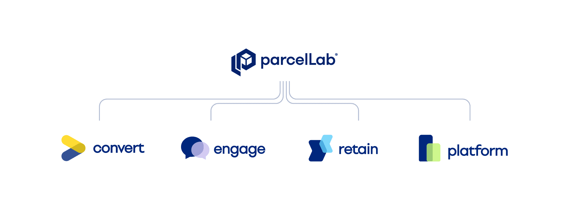 Each of parcelLab's four products — Convert, Engage, Retain, and Platform — required its own visual identity within the broader brand system. I designed a logo for each product and a dedicated landing page, creating a consistent visual language that connected the product suite back to the parent brand.