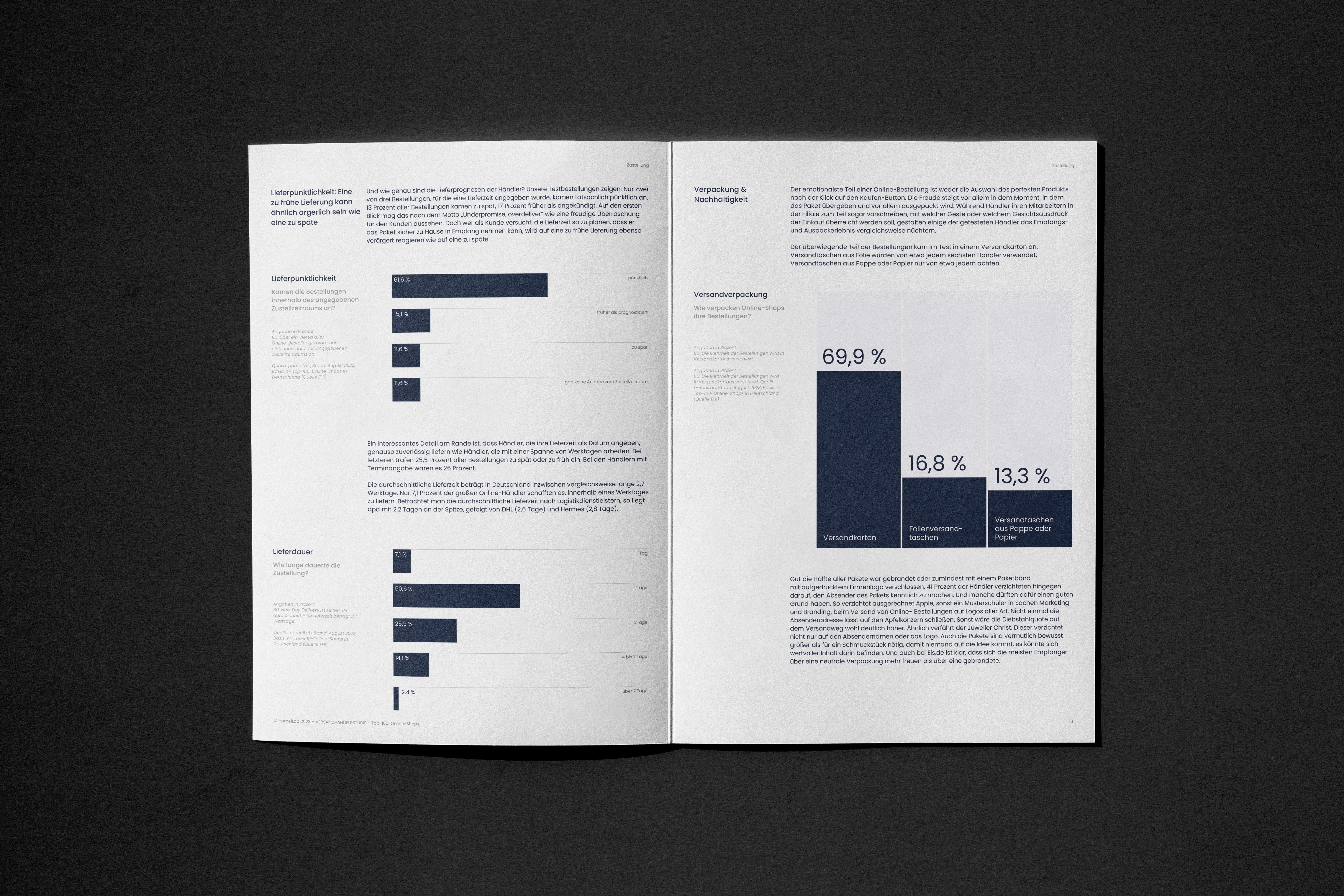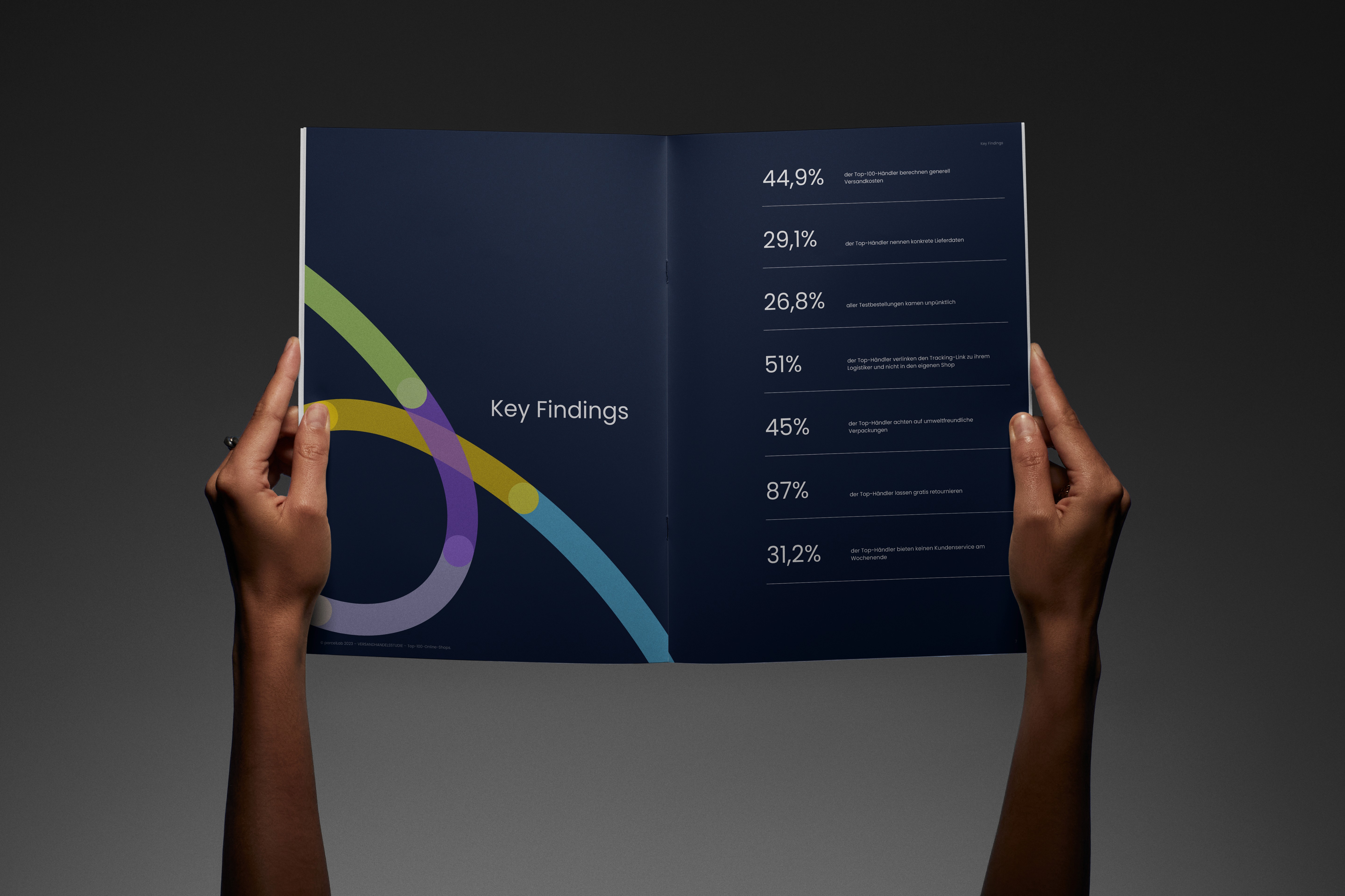 I led the complete design of the publication — 52 pages, 33 custom charts, and a full visual system that turned complex research data into something clear, compelling, and immediately usable by parcelLab's sales team. The work extended beyond the printed study into digital landing pages, social media assets, and printed collateral.